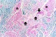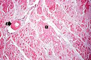 | 20:25, 20 August 2013 | IPLab6SenileAmyloidosis5.jpg (file) | 80 KB | This is a special stain for amyloid (Luxol PAS) demonstrating the amyloid (1) and fibrosis (2) in the myocardium. The amyloid is darker purple/magenta and tends to be more amorphous. The fibrosis is pink and more fibrillar. | 1 | |