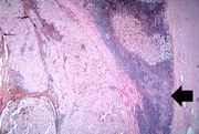 | 01:55, 21 August 2013 | IPLab7Melanoma3.jpg (file) | 21 KB | This is a low-power photomicrograph of lymph node that is almost completely replaced/filled with tumor. This lymph node has a capsule (1) and some remaining lymphocytes (2) but the remainder of the node is replaced by tumor cells. | 1 | |