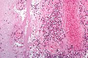| 03:47, 21 August 2013 | IPLab9BacterialMeningitis5.jpg (file) | 78 KB | This is a higher-power photomicrograph of inflammatory exudate in a sulcus. The majority of cells in this exudate are neutrophils. There is also abundant fibrin (arrows) and red blood cells are present in the congested vessels. | 1 | |