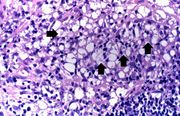 | 04:06, 21 August 2013 | IPLab10Histo3.jpg (file) | 90 KB | This is an even higher-power photomicrograph of an area of necrosis (arrows). There is loss of cellular detail within this area. There are inflammatory cells present; however, it is difficult to differentiate the inflammatory cells from the native lymp... | 1 | |