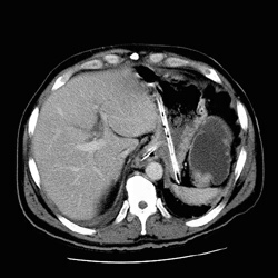 RADIOLOGY: GASTROINTESTINAL: GI: Case# 126: OBSTRUCTING COLON CA. 68-year-old male with bowel obstruction identified on plain films of the abdomen. The patient has worsening abdominal distention. 1. There is a high-grade colonic obstruction at the level of the splenic flexure. There is suggestion of a small soft tissue mass in this area. 2. There is a small right pleural effusion with some atelectasis in the right lower lobe. 3. The primary service was notified of the results immediately following the examination.