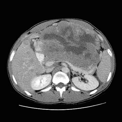 RADIOLOGY: ABDOMEN: Case# 32790: LARGE MASS - NEUROENDOCRINE TUMOR VS SARCOMA. 38 year old male with abdominal pain. Large intraabdominal mass with mesenteric implants and liver metastases has the appearance most consistent with a sarcoma. Due to its large size, it is difficult to determine its point of origin.
