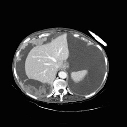 RADIOLOGY: ABDOMEN: Case# 33027: CARCINOMATOSIS. 80 year old female with history of umbilical herniorraphy and abdominal distention. 1) Large amount of ascites with multiple peritoneal based masses as described above. The appearance is consistent with peritoneal carcinomatosis from an as yet undetermined source. The differential diagnosis would include ovarian carcinoma, adenocarcinoma of the gastrointestinal tract, carcinoma of the breast, and renal cell carcinoma. There is apparent metastasis to the umbilical hernia site as well as to a 2 cm right inguinal node. 2) Small bilateral pleural effusions, right greater than left. 3) Simple left renal cyst.
