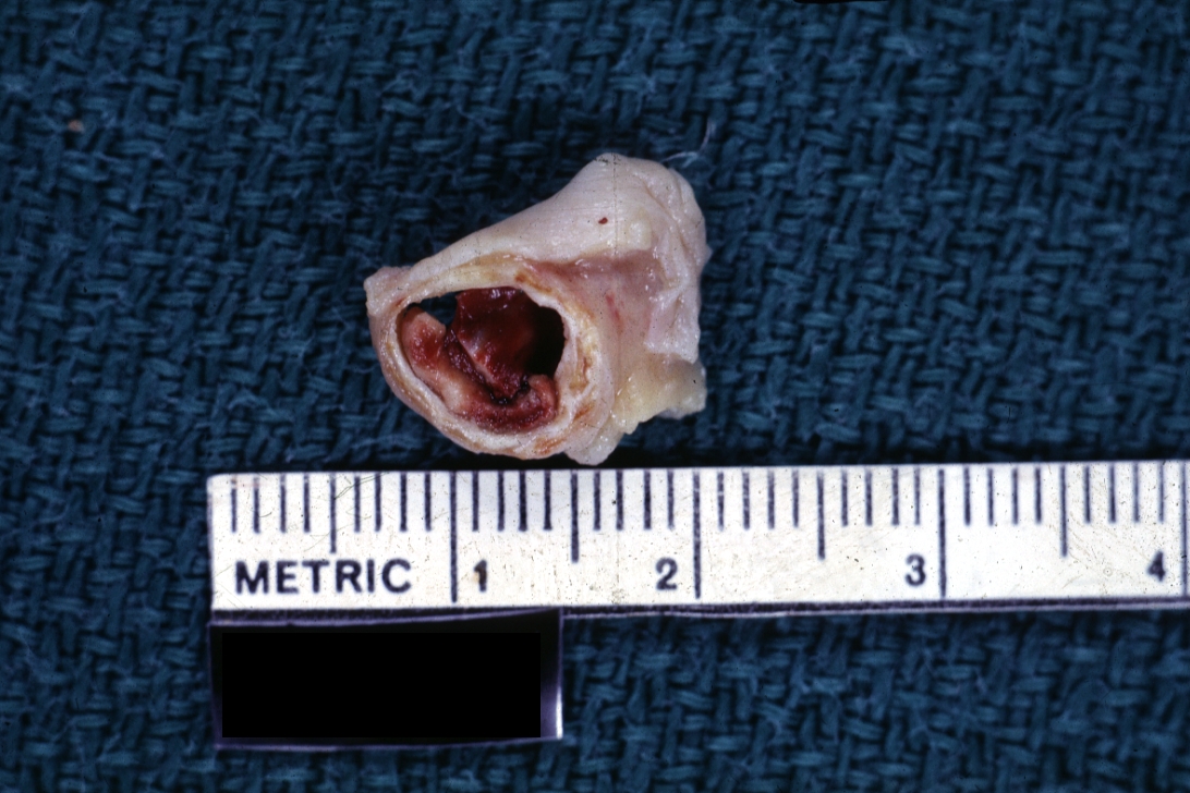 GROSS: CARDIOVASCULAR: VASCULATURE: Coronary artery: Thrombus: Gross cross section good example