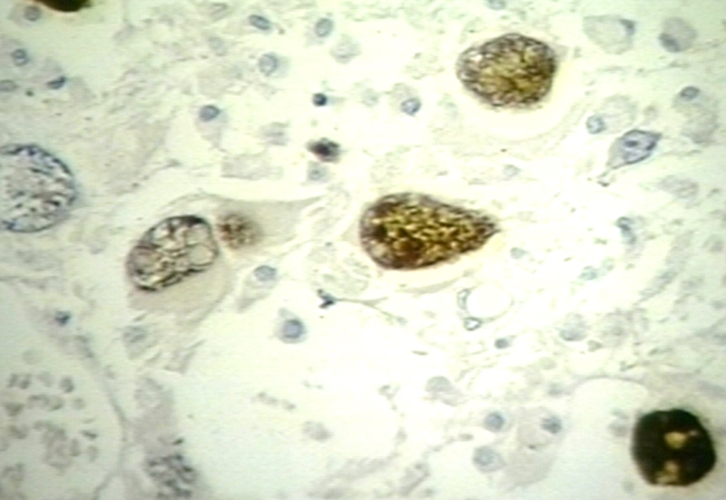 HISTOLOGY: NERVOUS: BRAIN: PROGRESSIVE MULTIFOCAL LEUKOENCEPHALOPATHY, PML; IMMUNOPEROXIDASE