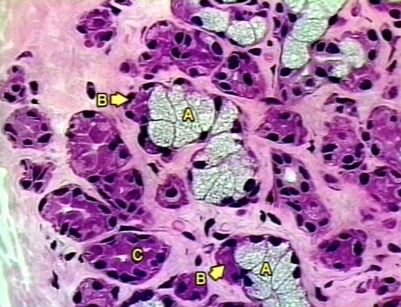 HISTOLOGY: SALIVARY GLAND: Sublingual Gland, Demilune, Duct; A=MUCOUS CELLS, B= DEMILUNES, C=SEROUS CELLS