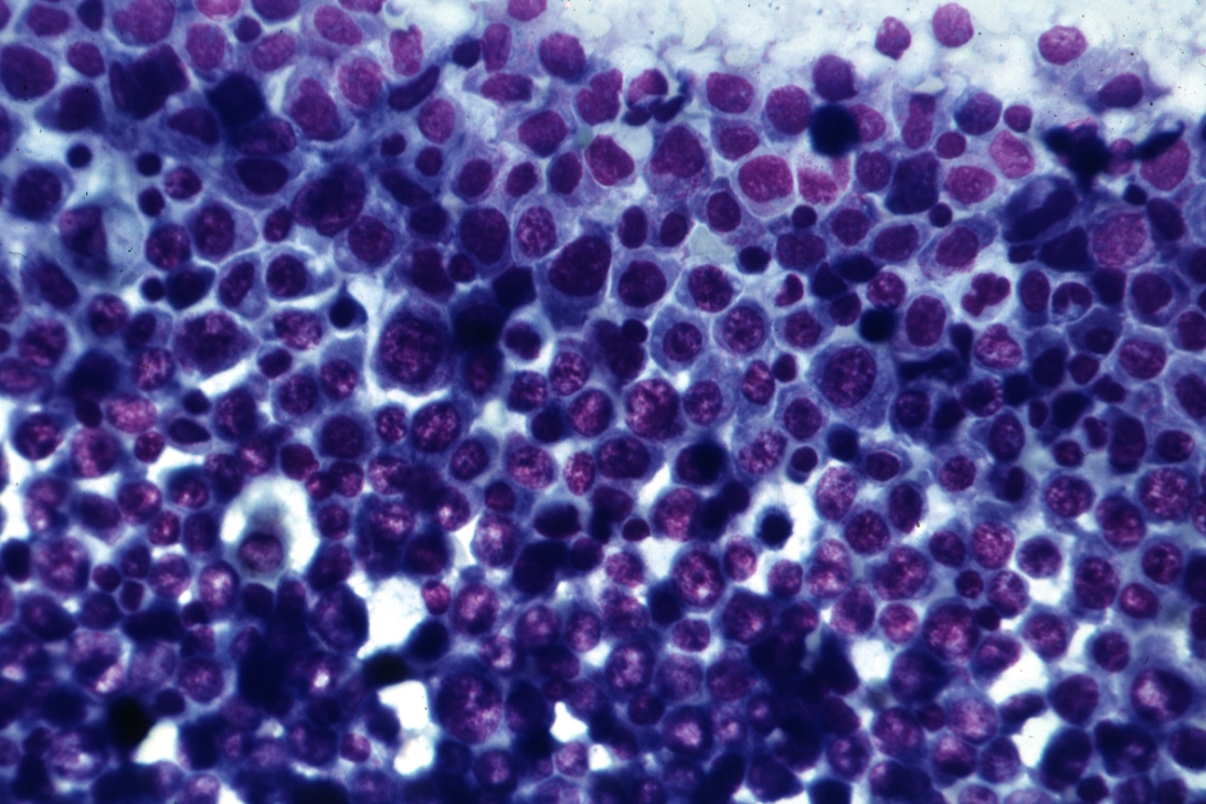 HISTOLOGY: HEMATOLOGIC: Bone marrow: Acute Myelogenous Leukemia: Micro high mag Wrights promyelocytic cells with considerable pleomorphism good example early transition from myeloproliferative disorder