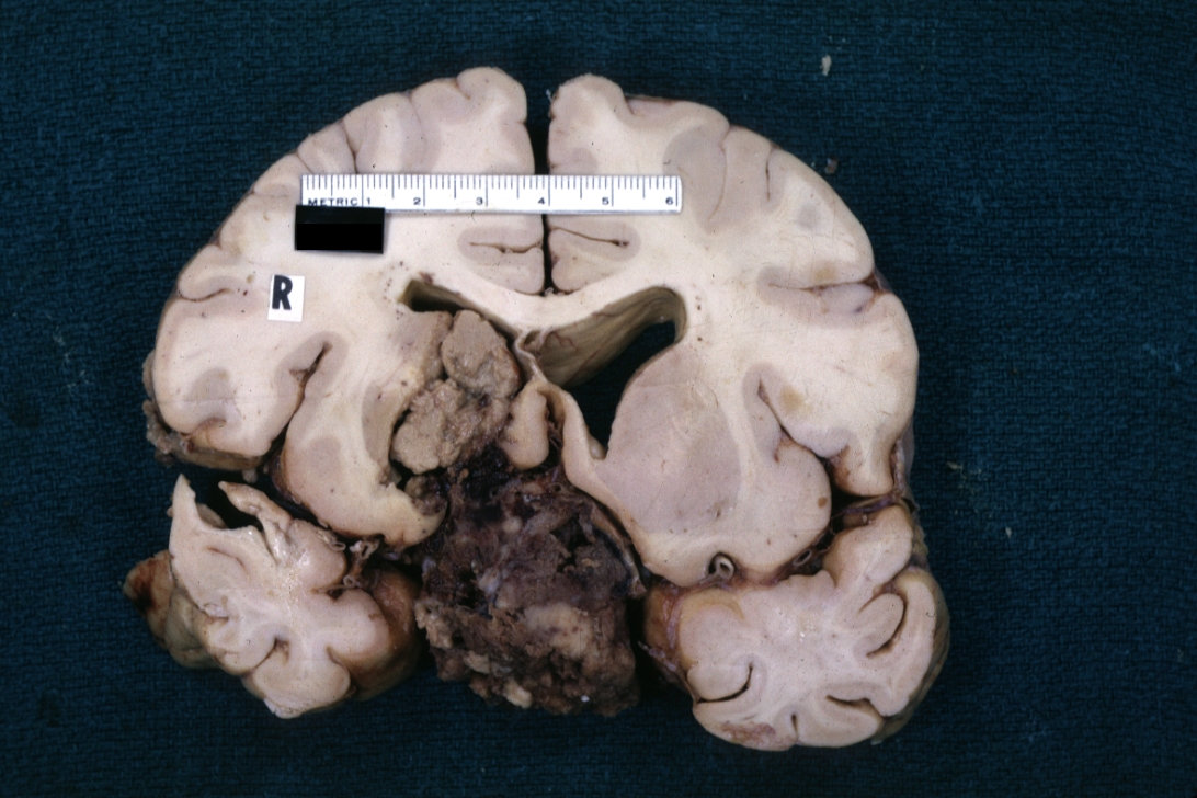 GROSS: ENDOCRINE: Pituitary: Malignant Adenoma: Gross fixed tissue large hemorrhagic tumor mass in position of pituitary gland that appears to have invaded into the lateral ventricle on the right side