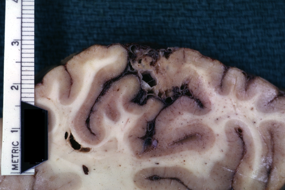 GROSS: NERVOUS: Brain: Arteriovenous Malformation: Gross fixed tissue close-up view of malformation in meninges and cerebral cortex outstanding example