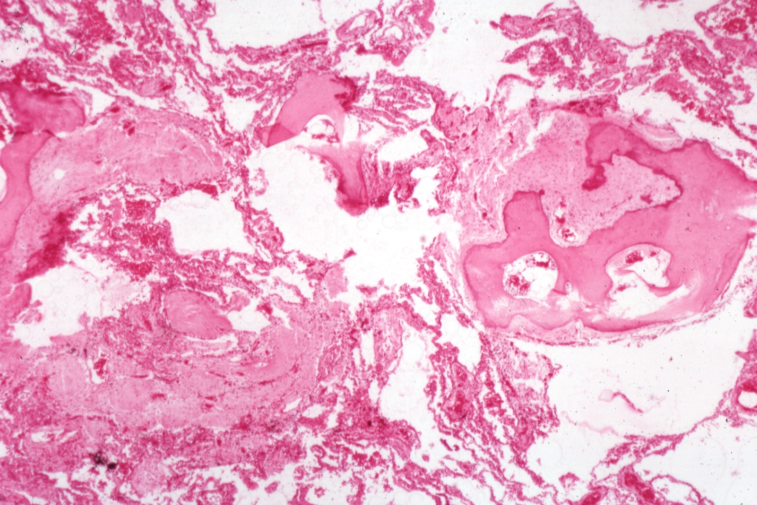 HISTOLOGY: RESPIRATORY: Lung: Dystrophic Calcification Ossification: Micro low mag H&E easily seen bone in scar
