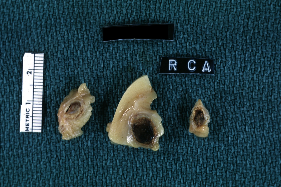 GROSS: CARDIOVASCULAR: VASCULATURE: Coronary artery: Atherosclerosis Thrombotic Occlusion: Gross fixed tissue multiple cross sections close-up very good