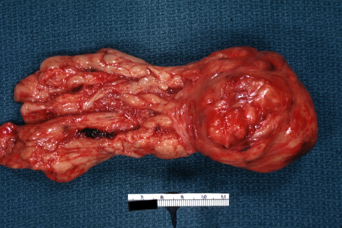 GROSS: CARDIOVASCULAR: HEART: Malignant Thymoma: Gross natural color cylindrical mass removed from superior vena cava just above right atrium and extending into right atrium