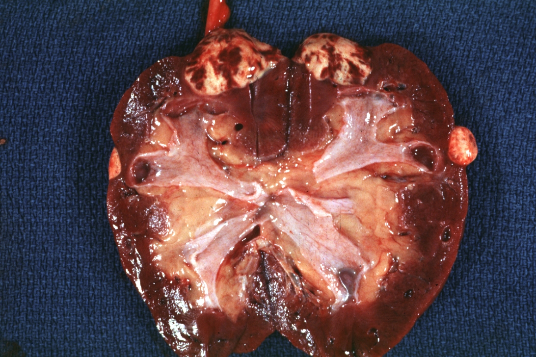 GROSS: Urinary: Kidney: Carcinoma: Gross natural color opened kidney with one large lesion and a smaller adenoma case had multiple adenomas in kidneys and carcinoma in each case of rheumatoid arthritis with cord compression