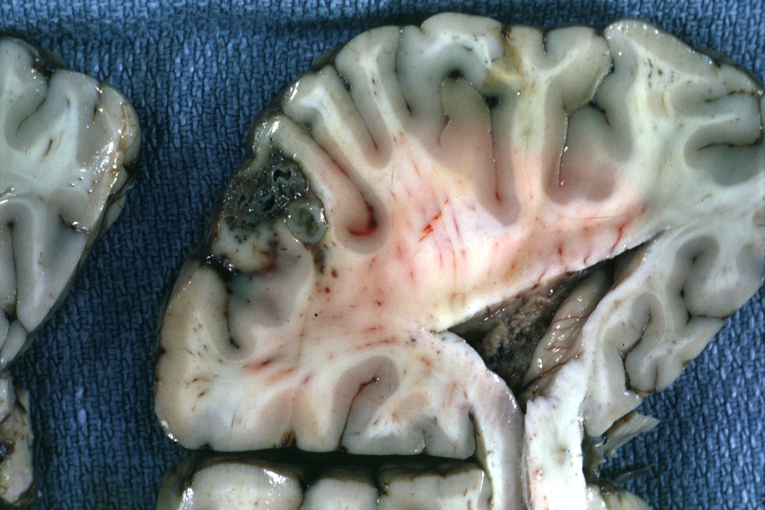 GROSS: NERVOUS: Brain: Arteriovenous Malformation: Gross fixed tissue close-up of cortical lesion quite good