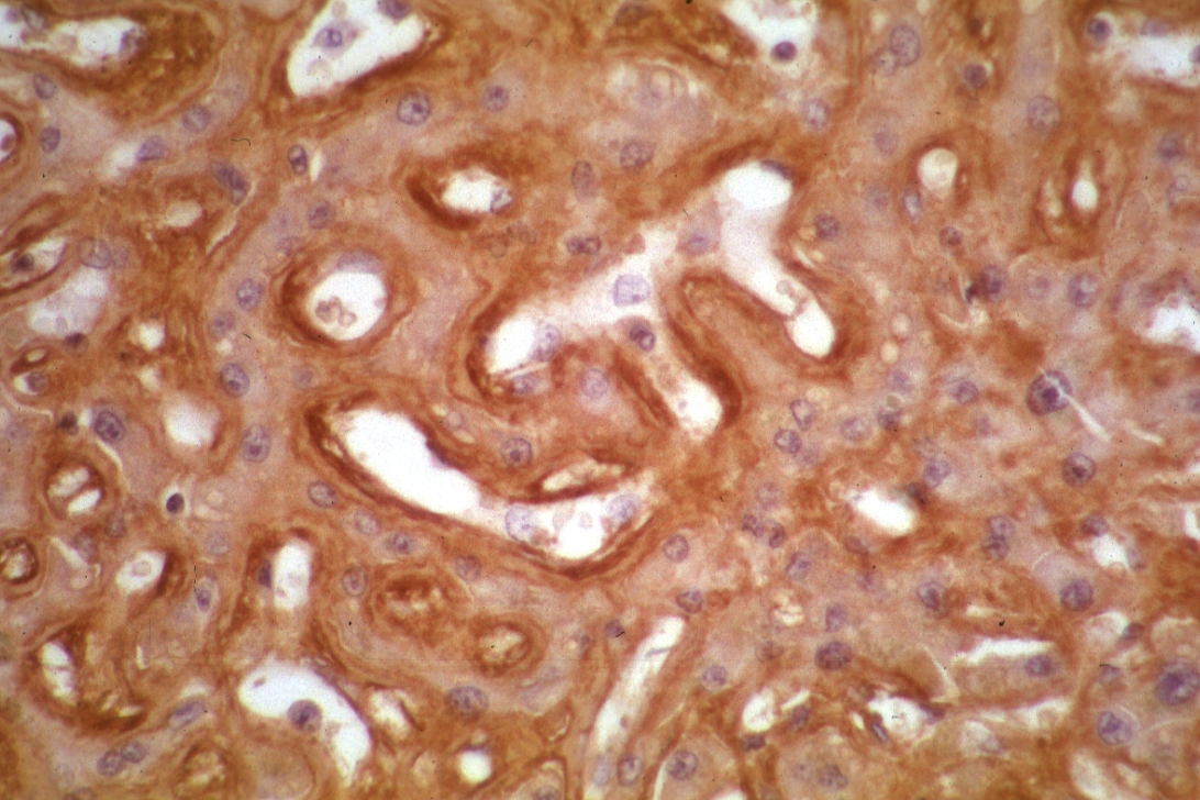 HISTOLOGY: Urinary: Kidney: Amyloidosis Kappa Chain Stain: Micro med mag kappa chain stain showing positive reaction in peritubular deposits
