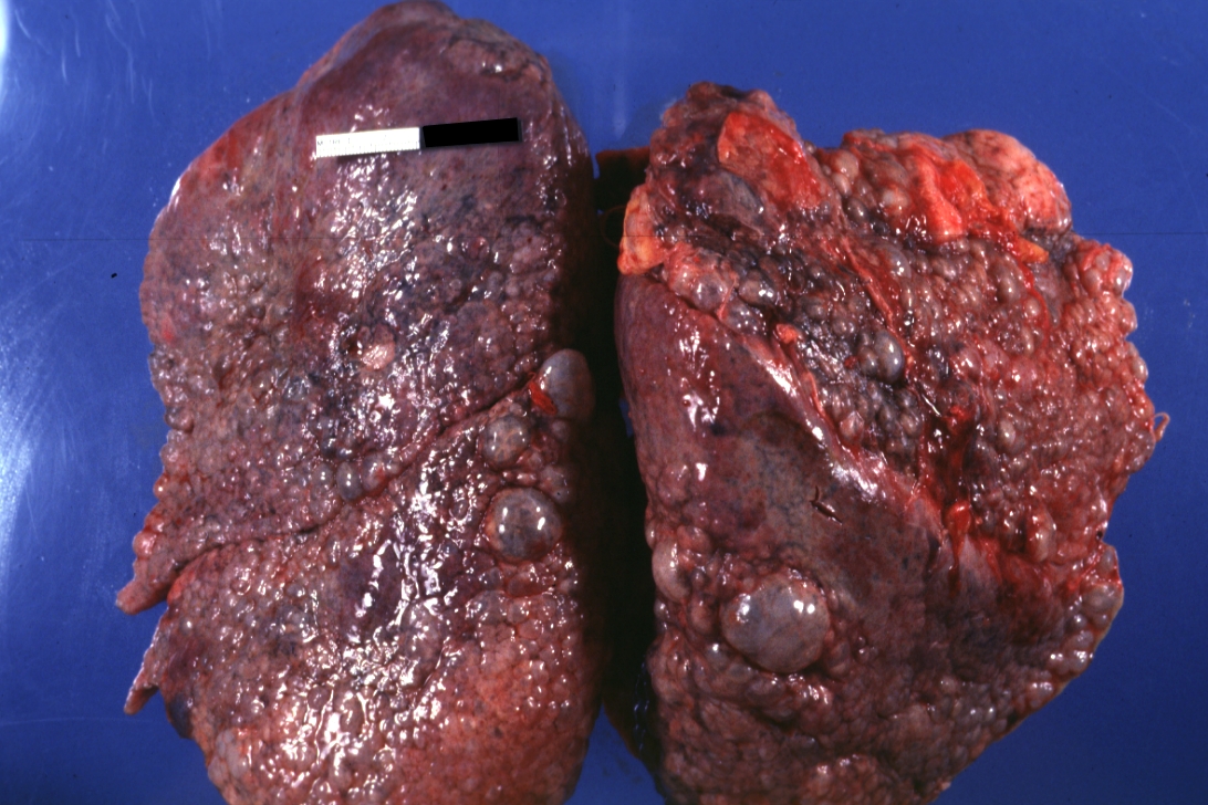 GROSS: RESPIRATORY: Lung: Fibrosis Severe With Pleural Bullae: Gross natural color external view of cirrhotic lungs with subpleural bullae